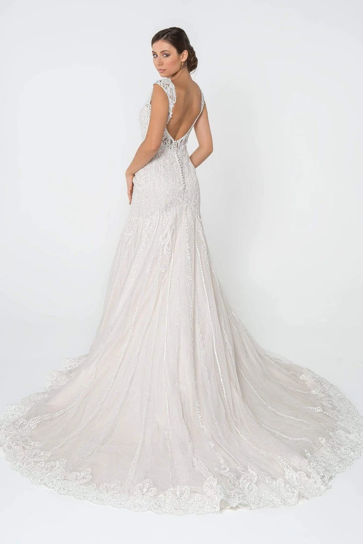 Wow the crowd as you walk in this masterpiece by Elizabeth K GL2821. Showcases a sleeveless, deep V-neckline with a low scoop back. Made of lace appliques and adorned with embellishments, the dress flatters your figure and is detailed with covered buttons at the back. The dress completes the look with a full length trumpet skirt and is designed with a train finish. This Elizabeth K dress evokes princess-inspired elegance in a soft and romantic silhouette.