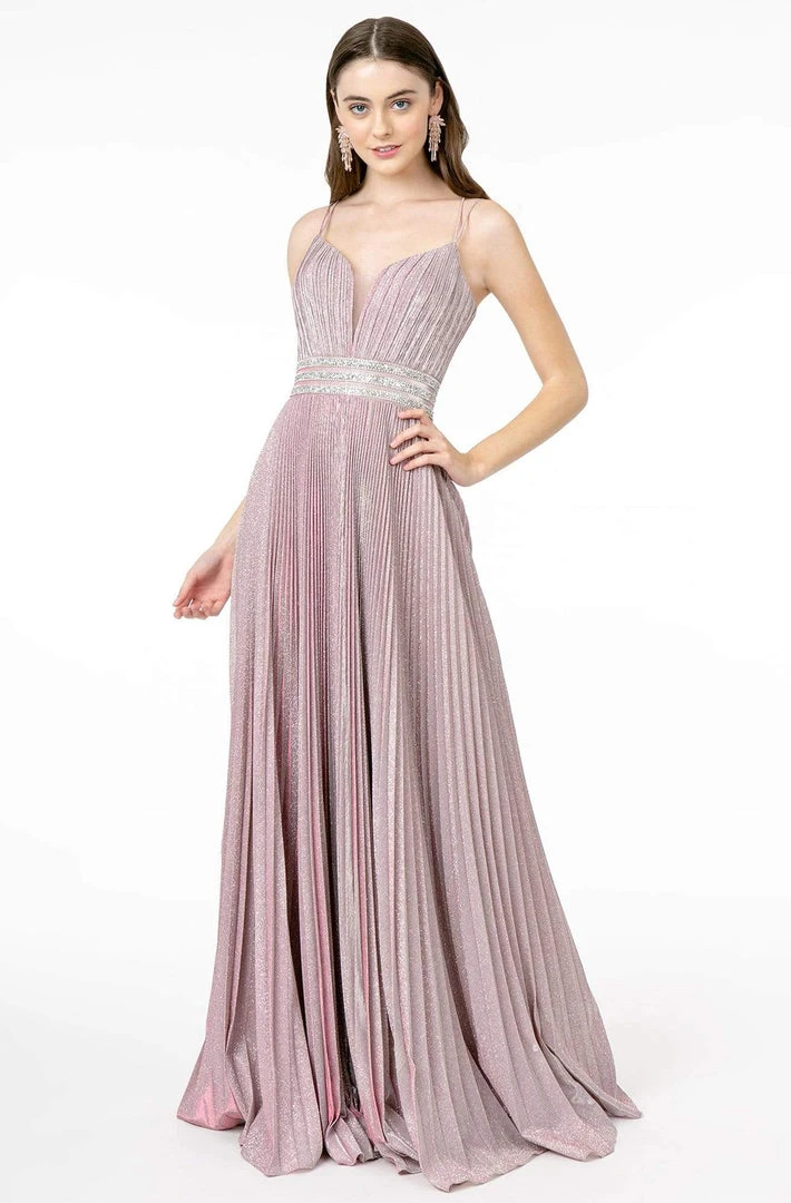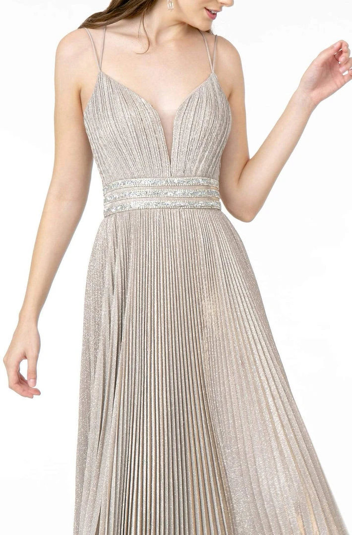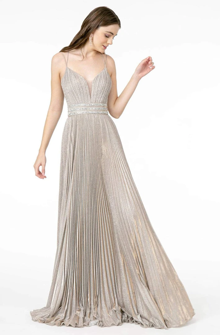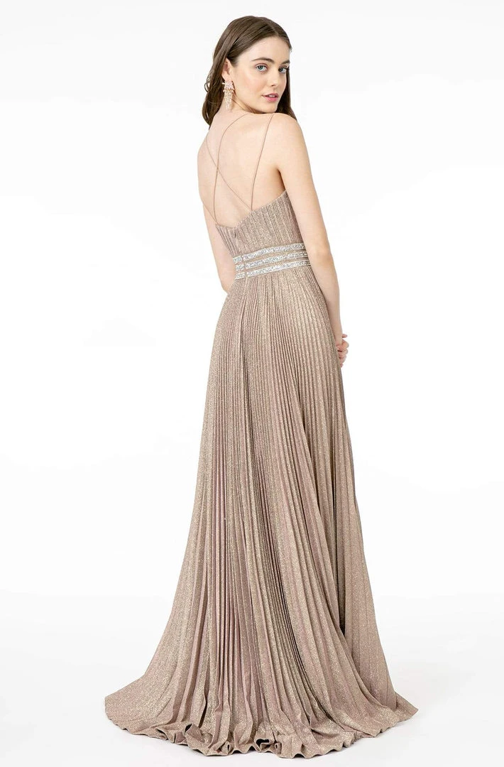 Walk in glamour and let all heads turn on you in this creation by Elizabeth K GL2905. Draped in a full-length finely pleated metallic glitter lame, this shimmering gown is sleeveless tailored with an illusion deep V neckline with sheer mesh inset, double spaghetti shoulder straps leading a crisscross style, mid-open back. This stunner comes with crystal studded triple band on the highlighting waist and a full-length A-line skirt that finishes in a sweep train. Be dressed up elegantly by Elizabeth K.