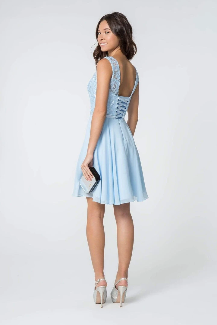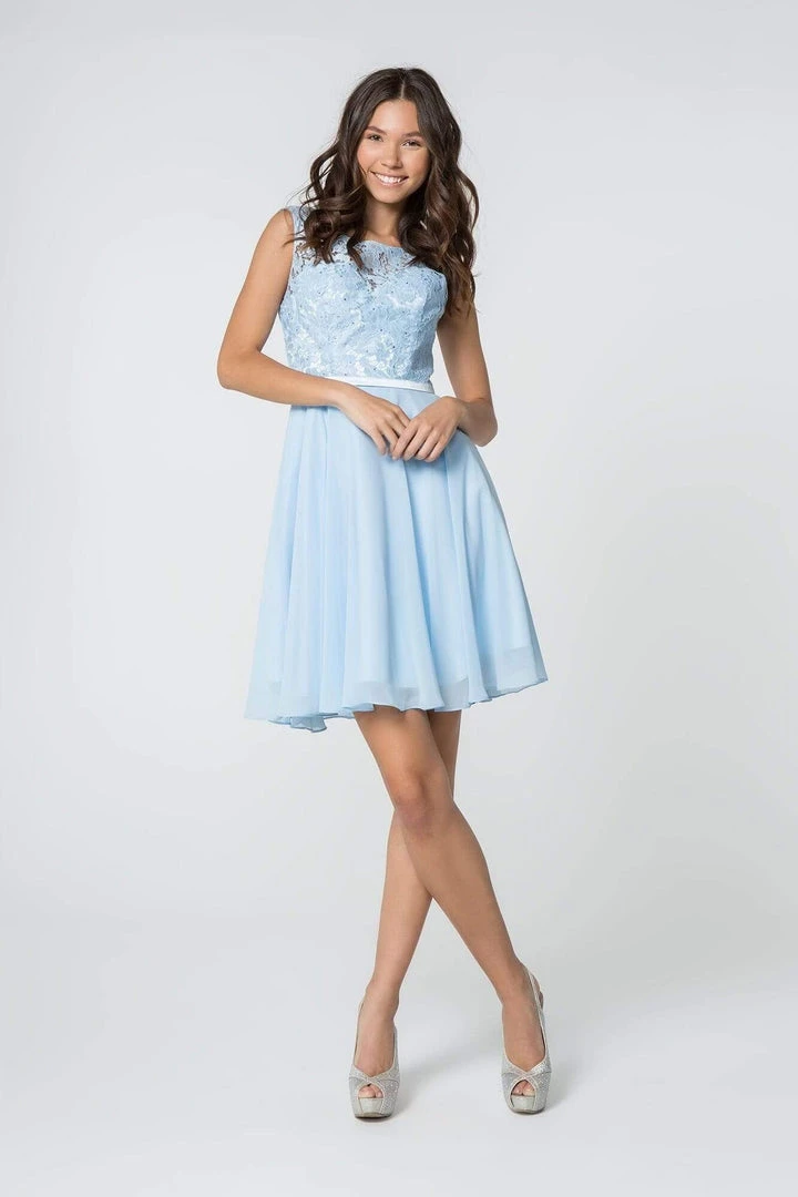 Draped with rhinestone ornate lace bodice, this dress charms with a bateau neckline paired with a corset lace up back. Nipped with a satin waistband, the fluttering chiffon skirt flows into a short hemline. Models are wearing the Baby Blue and Blush colors,