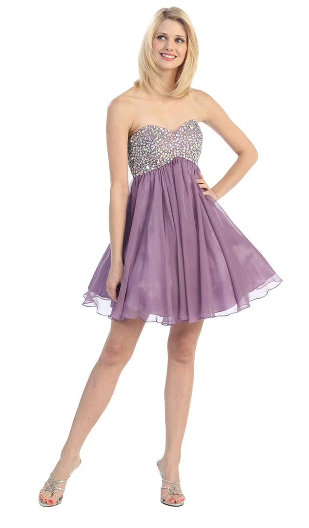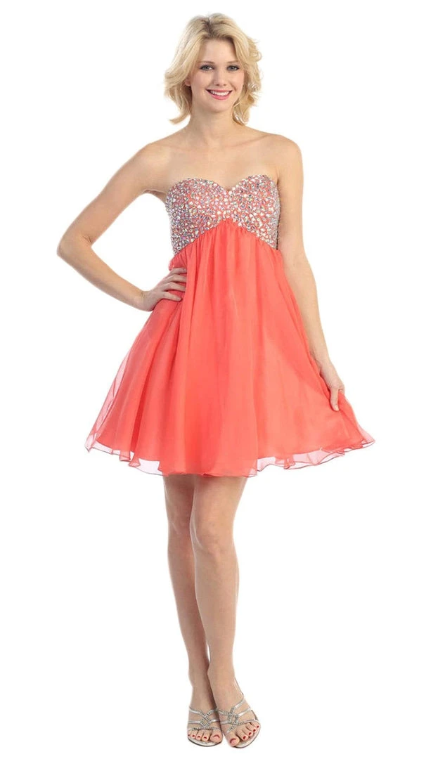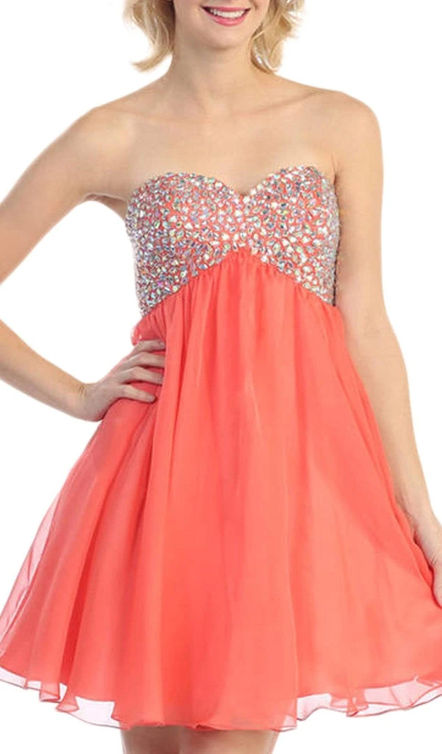 Dance the night away in this dazzling dress from Eureka Fashion 2301. This fun cocktail dress showcases a strapless, sweetheart neckline with bust lavishly ornate with bead embellishments. From the empire waist begins a mid-thigh chiffon flowy A-line skirt. Sparkle in beauty wearing this cocktail dress from Eureka Fashion. Model is wearing Coral color.
