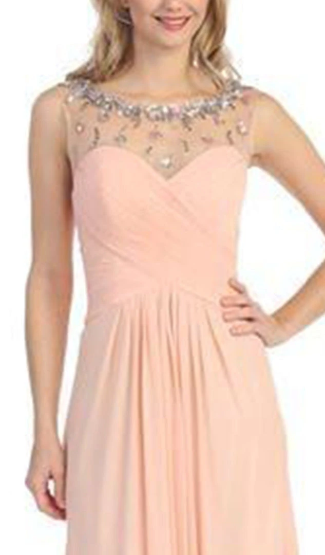 Be ready to fascinate everyone with this design from Eureka Fashion 2666. Features a sleeveless, illusion bateau neckline with sweetheart lined bodice ornate with bead embellishments. Criss crossing pleating details line the fitted bodice and gives way to a full length chiffon sheath skirt. The dress has a side zipper closure and includes a matching shawl. Orchestrate your moment to stand out in this Eureka Fashion creation.
