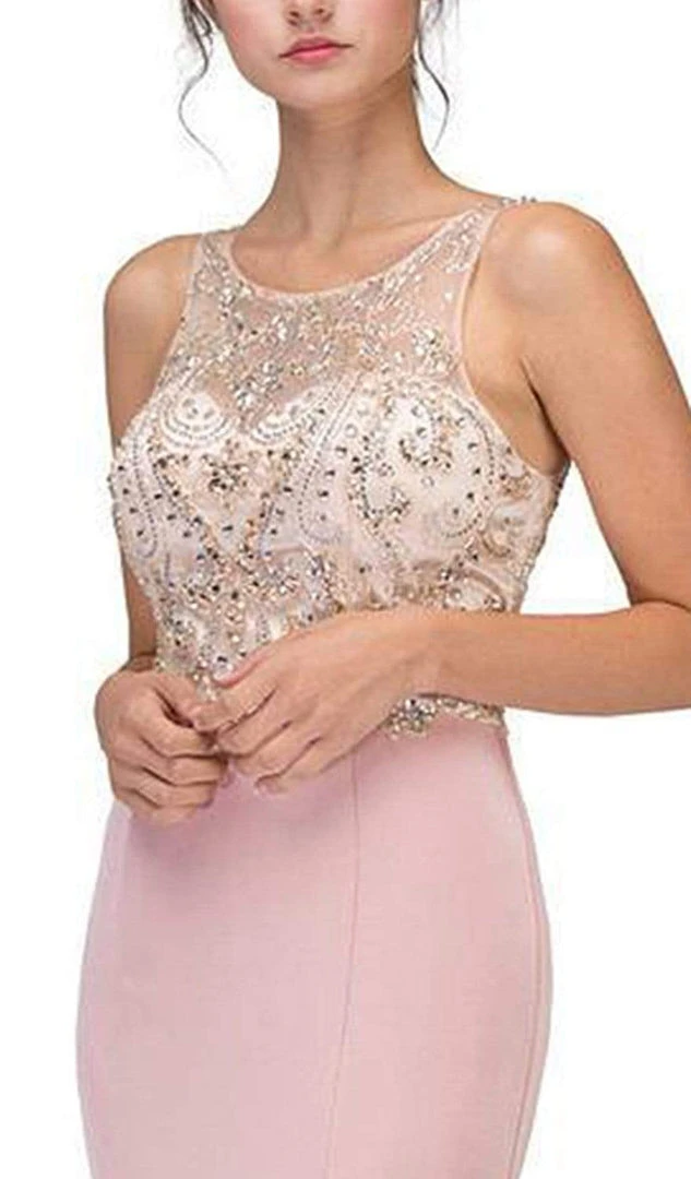| Details: | Beaded Bodice, Sheer Neckline, Sleeveless, Seamed Skirt, Pleated, Floor Length, Scoop Back, Back Zipper Closure, Sweep Train |