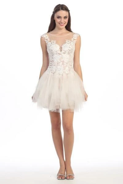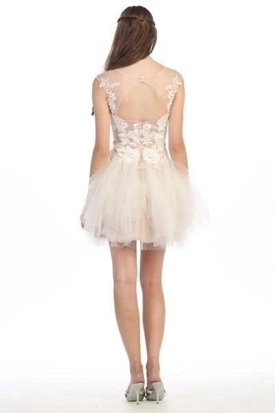 Optimize the attraction of your special event in this charming dress by Eureka Fashion 3911. Allures in a cap sleeve, illusion bateau neckline with fitted bodice decorated with lace embroidery. The back flaunts a sexy back cutout while the mesh A-line skirt runs at mid-thigh hem. Dress to the nines in this glam dress by Eureka Fashion.