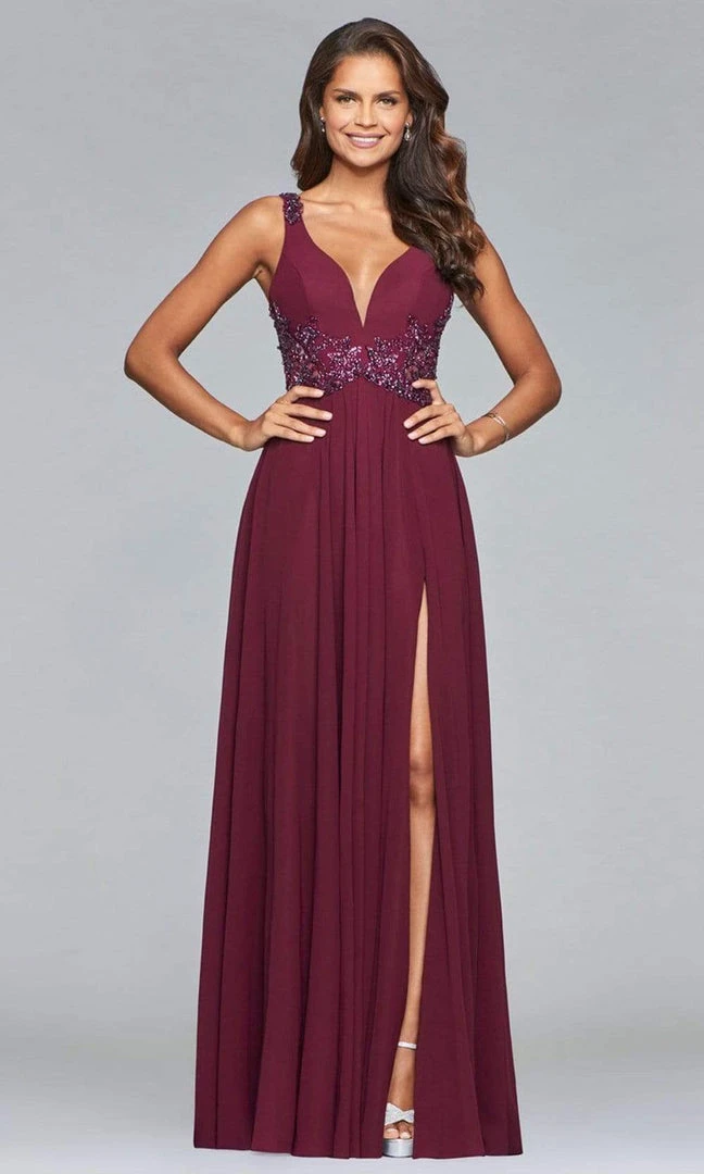 This sophisticated dress features a plunging V neckline and sleeveless bodice. This dress is crafted in chiffon fabric with a beaded waistline and straps, and a cutout back detail. The thigh-high slIt creates a sassy finish on this fantastic design. This A-line ensemble cascades gorgeously to the floor. Models are wearing Navy and Chianti colors.
