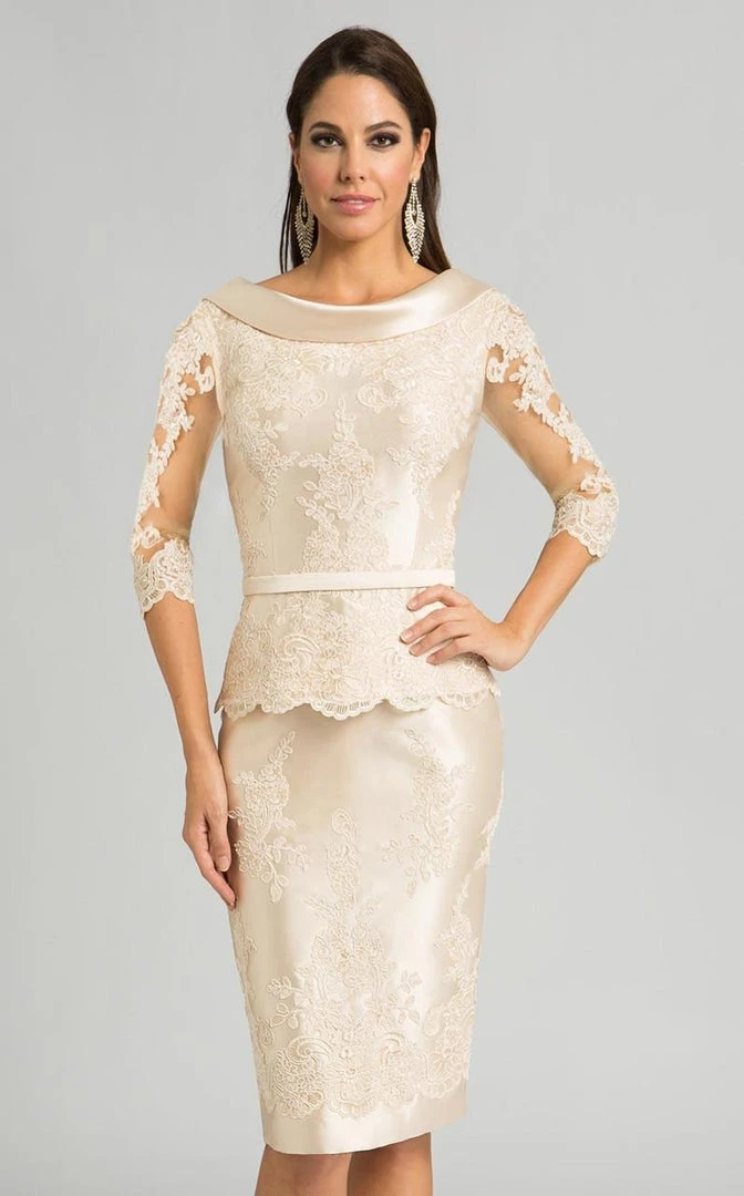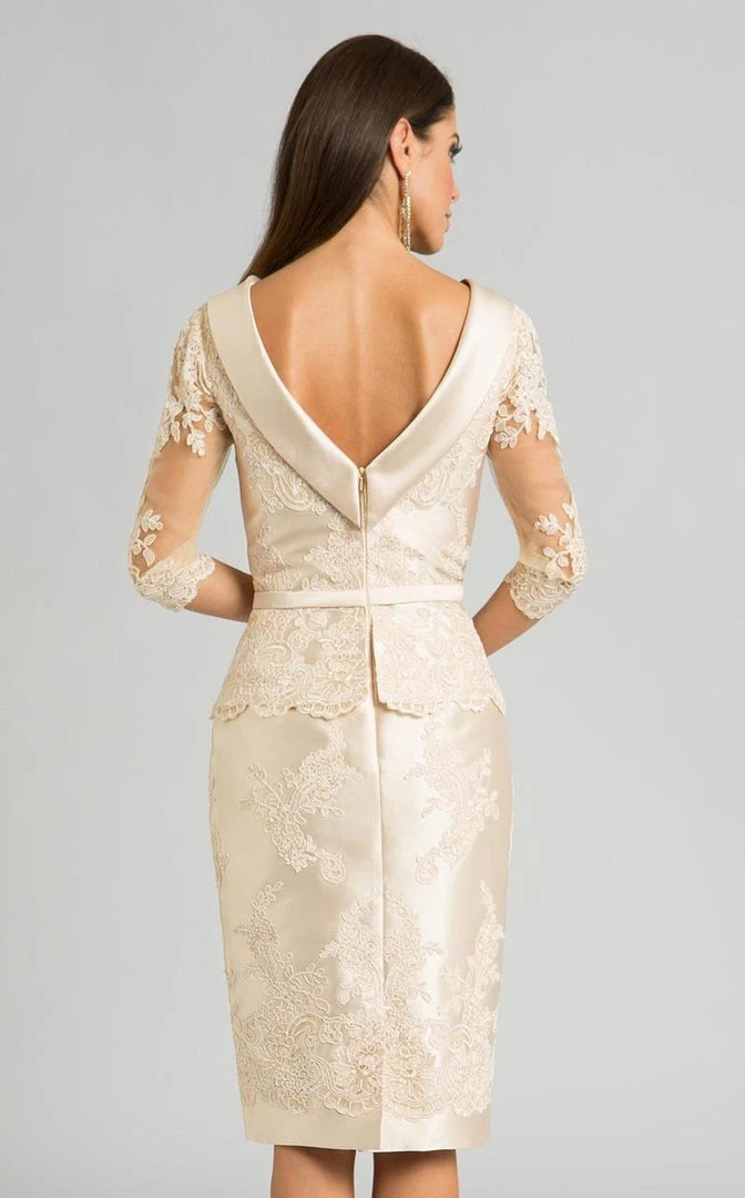 | Details: | Quarter length sleeves, Lace appliques, Ribbon waistband, Scallop-edged Peplum effect, Sheath skirt, V-back, Back zipper, Sheer fabric |