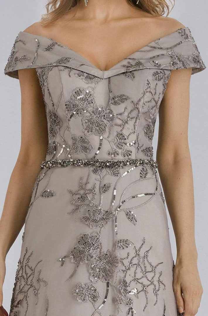 Make a grand entrance as you exude charm and beauty in this Feriani Couture 18960 creation. Perfectly embellished with floral beadwork allover its statuesque length, this gown features an off shoulder neckline with a foldover design. Draped to render a pair of short sleeves, this ensemble charms with a beaded waistband and a mid-open back. The A-line silhouette flares into a full-length hemline. Shine all night long in this shimmering Feriani Couture masterpiece. Model is wearing the Silver color.