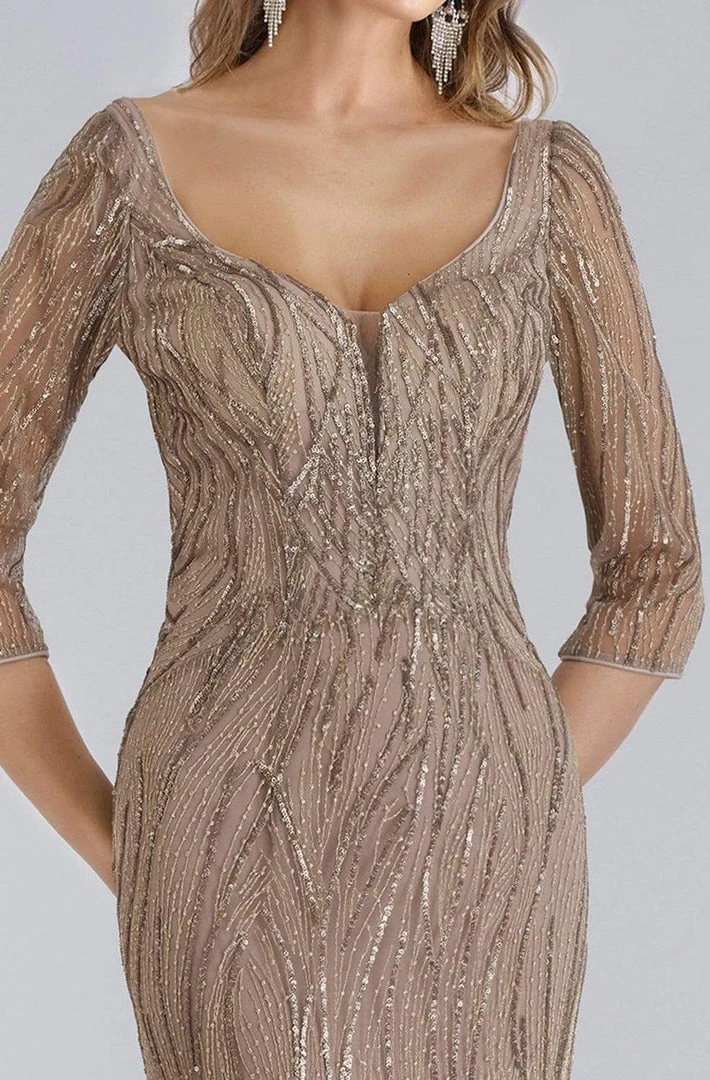 Look exquisite in this incomparable gown from Feriani Couture 26300. Intricate sequin embellishments design the fitted bodice framed with a scoop neckline with deep sheer inset panel and quarter length sleeves. The skirt features a trumpet silhouette which charmingly finishes with a sweep train. This Feriani Couture creation is truly remarkable!