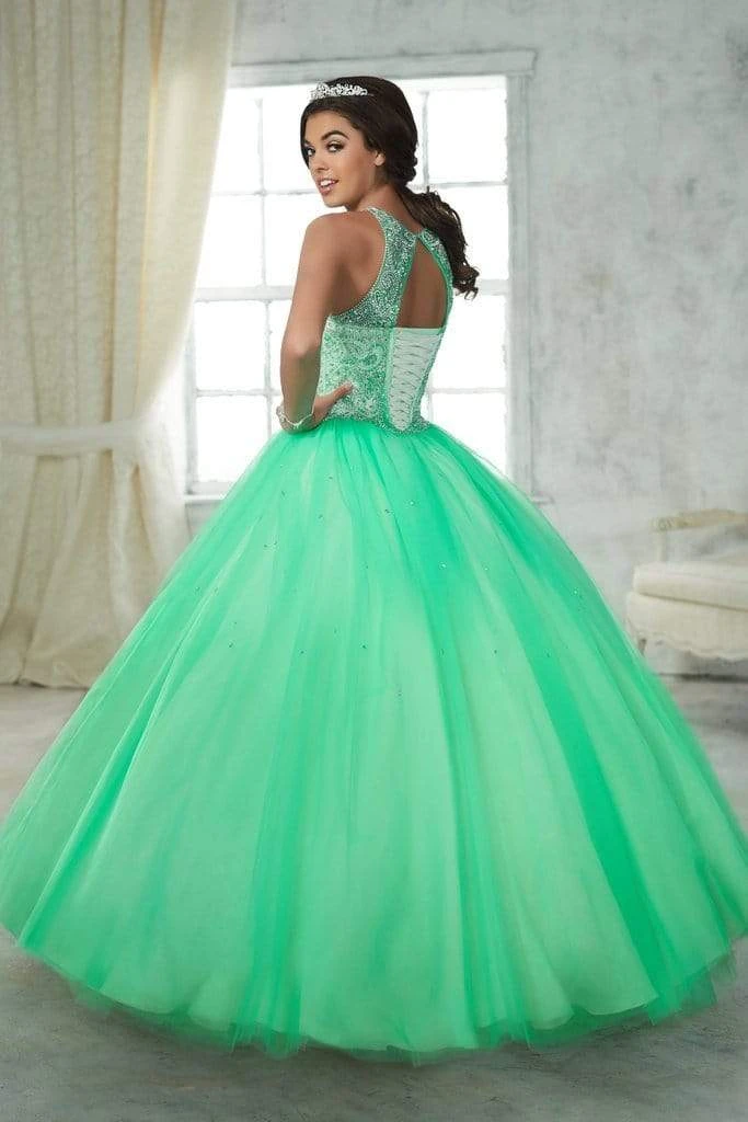 Capture that striking presence and get everyone’s attention in Fiesta Gowns 56316. Charms in a sleeveless, halter neckline with fitted bodice embellished with beading. The back has a lace up closure and from the waist flourishes a full length tulle ballgown skirt. Be ready to fascinate everyone with this Fiesta Gowns design.