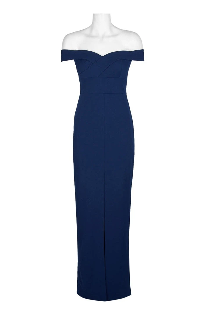 Walk in refined sophistication and let all heads turn on you in this creation by Aidan Mattox MN1E202585. This solid scuba crepe dress flaunts a stylish off-the-shoulder neckline with banded sleeves and crossover fitted bodice. Its fitted silhouette is defined by fine princess seams while the full length sheath skirt graces towards the floor with a high, front center slit. This Aidan Mattox style is a sure standout on your next evening social event.