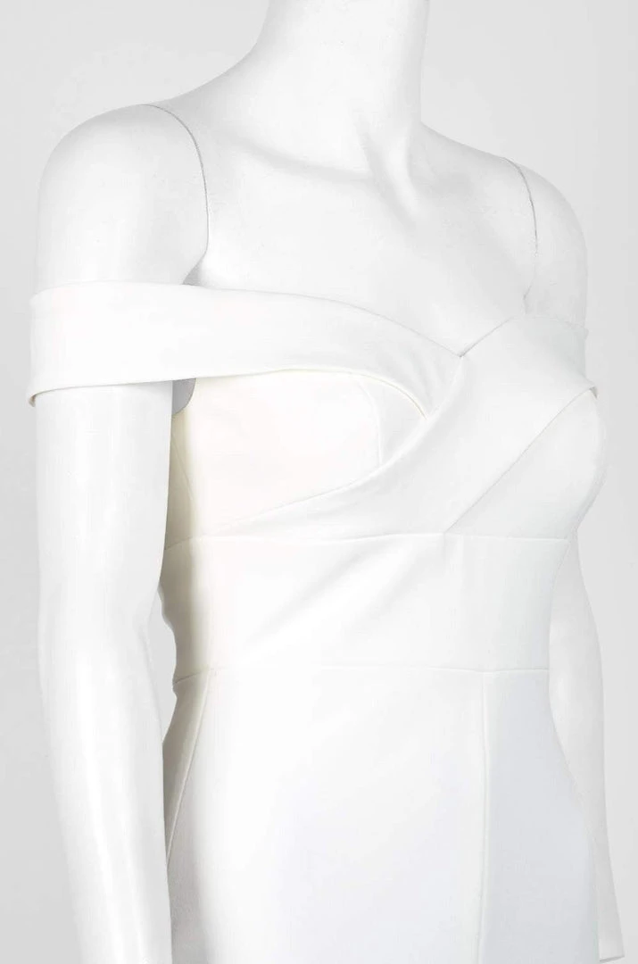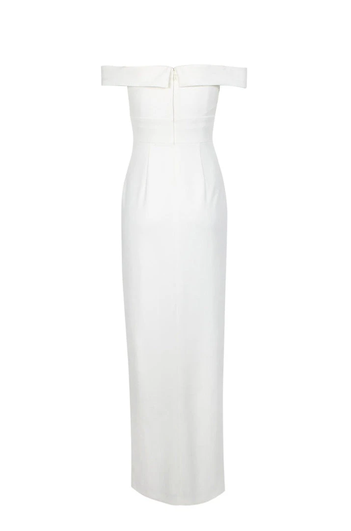 | Details: | Scuba crepe fabric, Banded off-shoulder sleeves, Princess seams, High center slit, Back zipper closure |