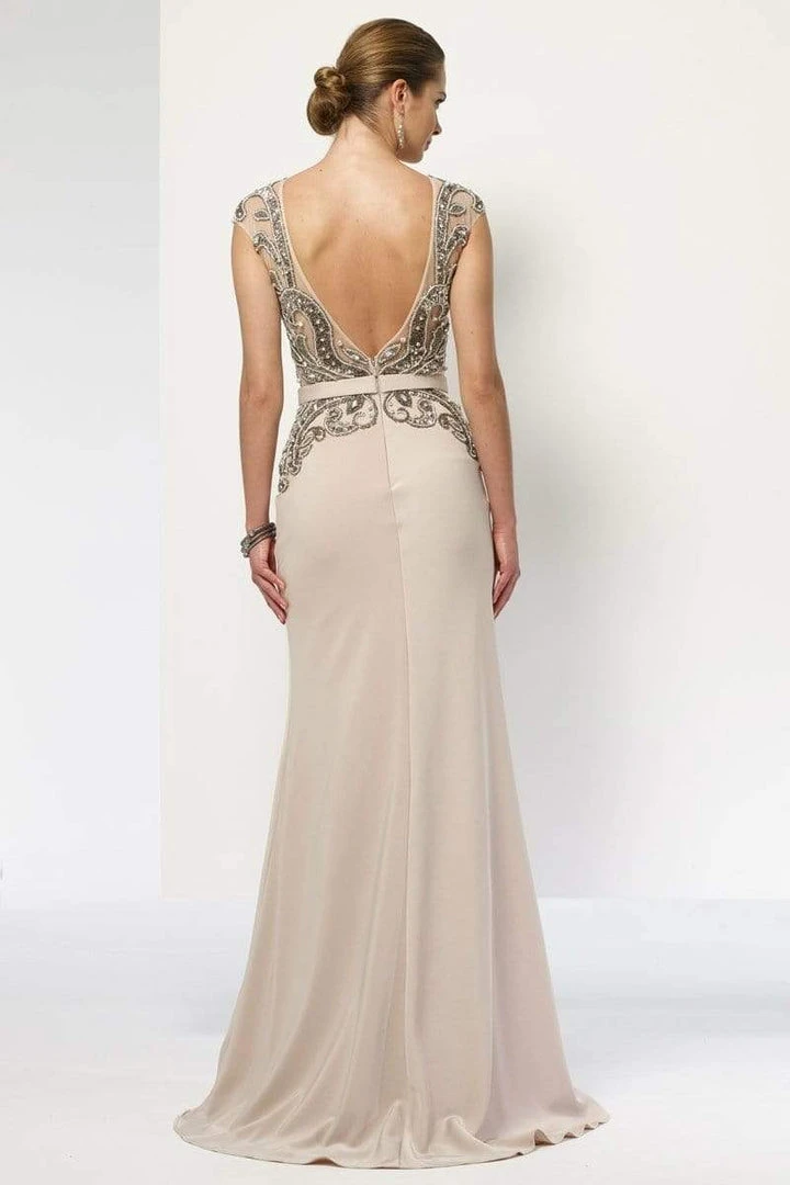 Long Formal Wear, Stretch Crepe, Illusion Neckline, Straight, V-Shaped Back, Beaded Top And Waist, Cap Sleeves, Set-on waistband, Hidden back zipper