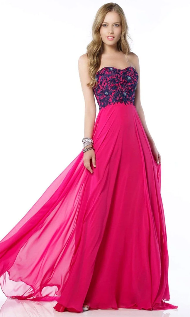 Strapless semi sweetheart neckline with an embroidered bodice and a flowy chiffon skirt and a low back keyhole.
