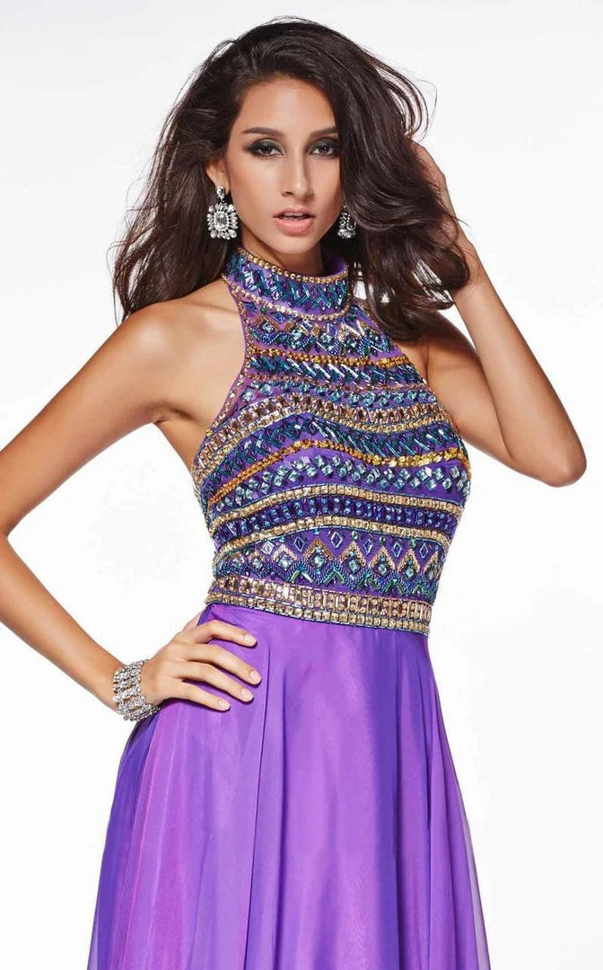 Take their breath away from the moment that you enter the room in this stunning beaded chiffon evening gown by Angela & Alison 51070. Fitted from the high collar sleeveless neckline to the natural waist, this gown embrace your curves as intricate beadwork shimmers and shines opulently in the light. The airy chiffon skirt flows gracefully from the natural waist to the floor length hemline in sophisticated elegance making this Angela & Alison gown perfect for prom, pageants, and other formal events.