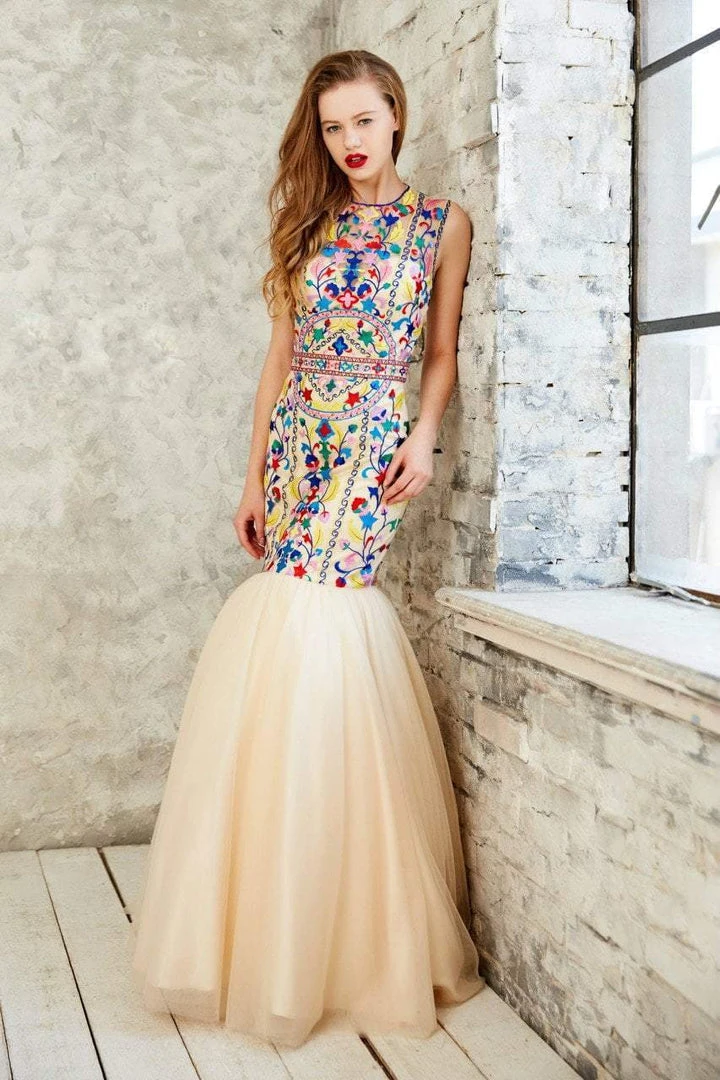 Show of your bubbly and festive personality in this breathtaking Angela & Alison 771023. A chic fully embroidered high neckline sleeveless mermaid gown with a tulle skirt, multi-colored floral embroidered bodice and open back. Be dressed up beautifully in Angela & Alison. Perfect for prom, homecoming, formal or social events!