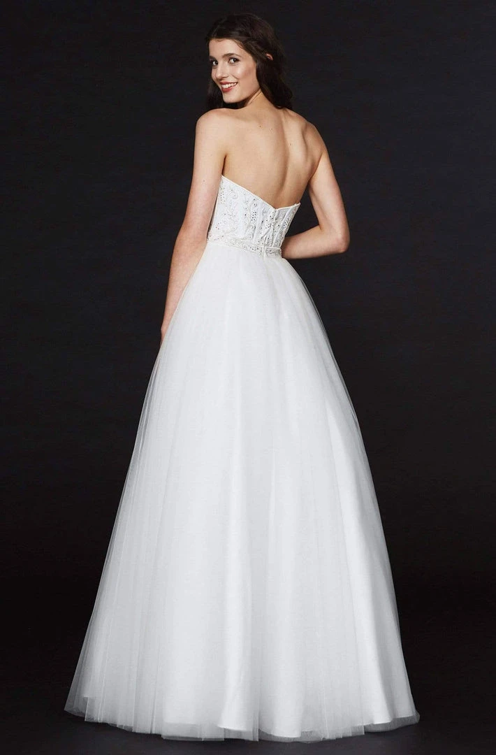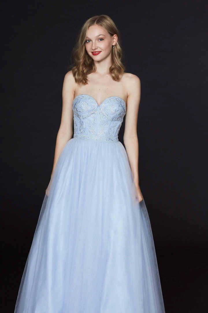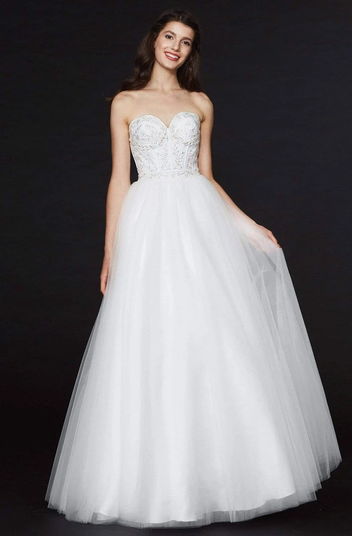 This charming ethereal strapless dress features a sweetheart neckline with corset bodice ornate with bead embellishments. The dress is secured at the back with zipper closure and the tulle skirt flourishes a full-length A-line silhouette.
