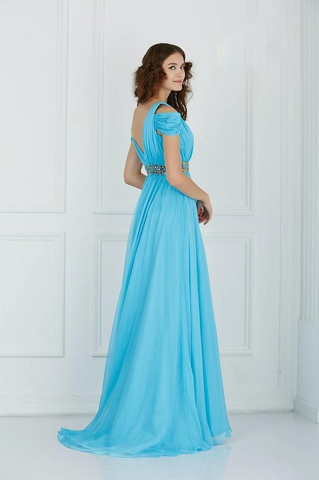 Simple elegance! This exquisite off shoulder evening prom gown is chic and on trend. The halter bodice has a Grecian style with a single embellished strap at its fitted waist. The floor length skirt features a sheer overlay leaving this dress soft, flowing and sexy.