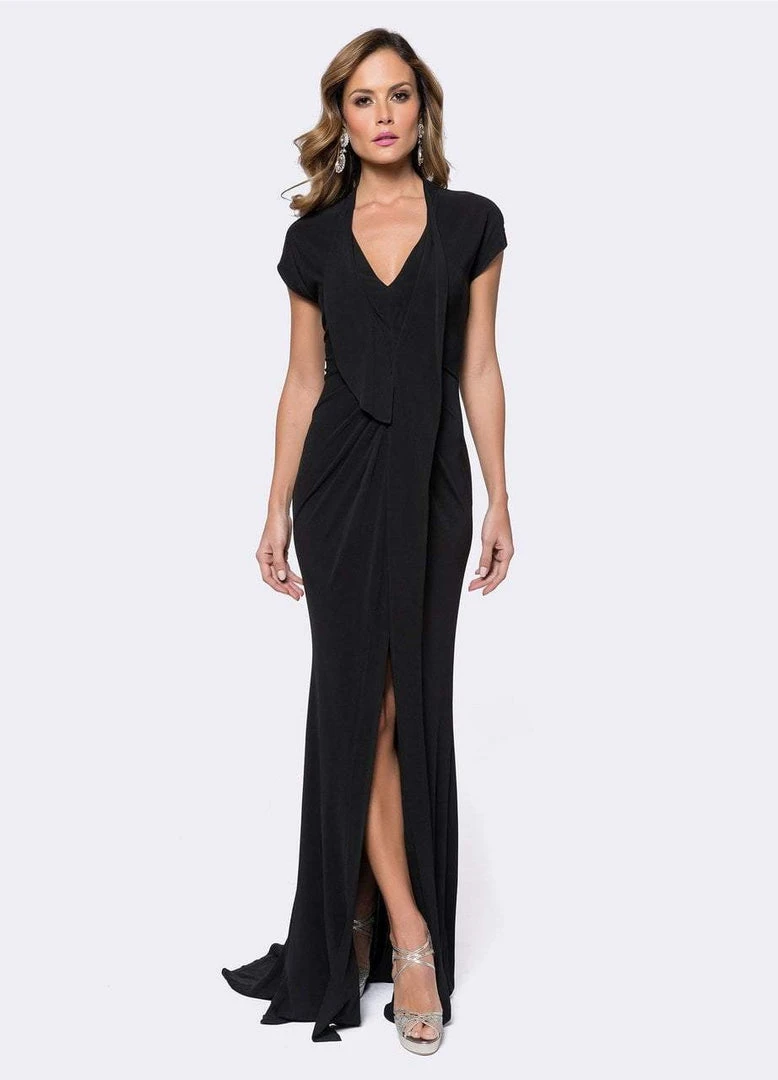 | Details: | Short sleeves, Draping accents, Oversized exposed zipper, Front center slit, Sheath skirt, Sweep train |