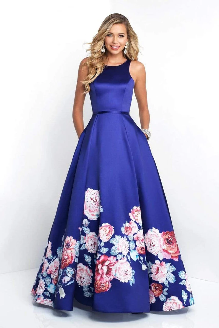 Be at your most captivating as you walk on the red carpet in this stunning Blush 11136 creation. Sculpted with seams in a sleek Mikado fabric, this beauty showcases a sleeveless fitted bodice topped with a jewel neckline. Designed with a diamond cutout on the back, this ensemble flaunts a nipped waist and a pronounced A-line skirt that radiates with elegant box pleats. This stunner has a full-length hemline adorned with a vivid flower print festooning the hem. Make everyone stop and capture your iridescence in this Blush masterpiece.