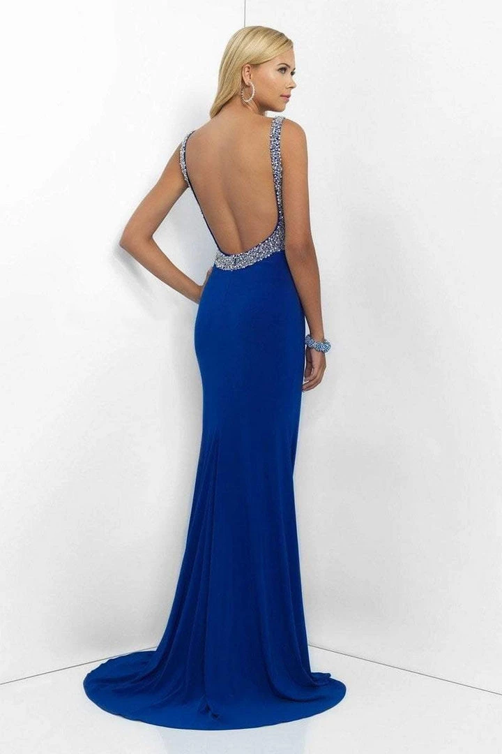 Steal the spotlight at your prom or formal event as you waltz in Blush 11032 by revealing the daring open back of this fitted jersey knit. AB stones and sequins trim the tank style straps, waist, and rounded low back while the skirt hugs your curves and falls to the floor giving you a statuesque silhouette. Look good, feel good with this classy dress by Blush.