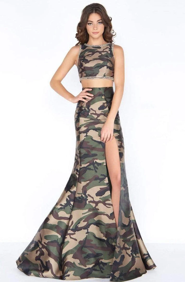 Look magnificent in this incomparable and modern dress from Cassandra Stone 40814. This two piece camo set features a fitted crop top with a bateau neckline and sleeveless cut trimmed with rhinestones. The midriff is exposed. The sexy skirt is accented with metal medallion buttons and a high slit finished with a gorgeous back train. The full back is secured with a center zipper closure. Make an ordinary statement in this Cassandra Stone masterpiece.