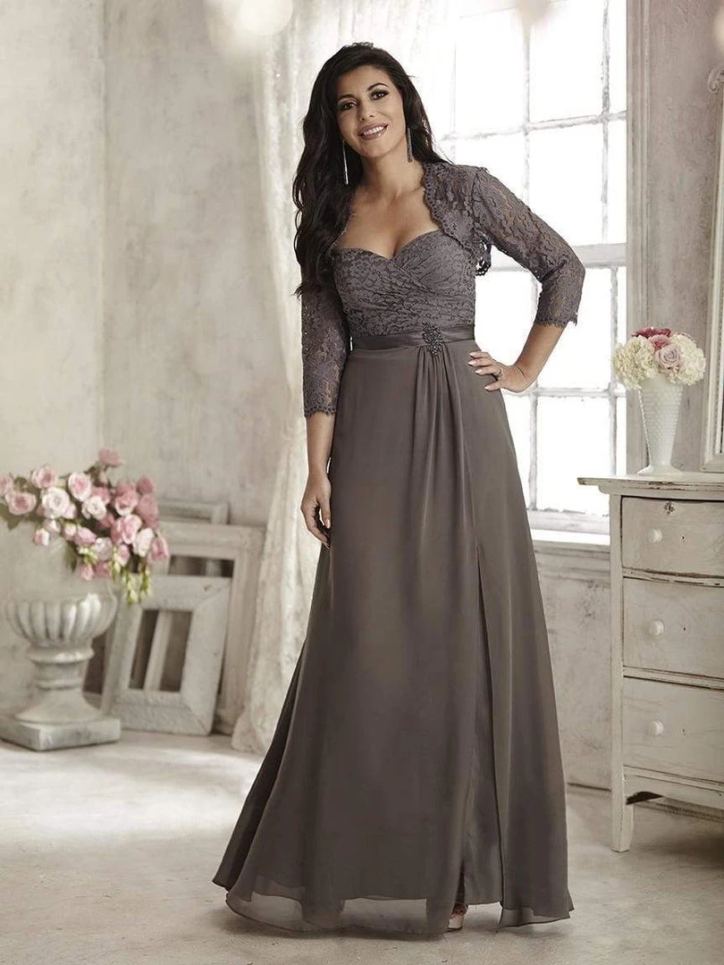 | Details: | Quarter Sleeve Bolero, Strapless, Surplice Lace Bodice, Brooch Accented Satin Band, High Slit, Mid-Open Back, Back Zipper Closure, Full Length Hem, Bolero |