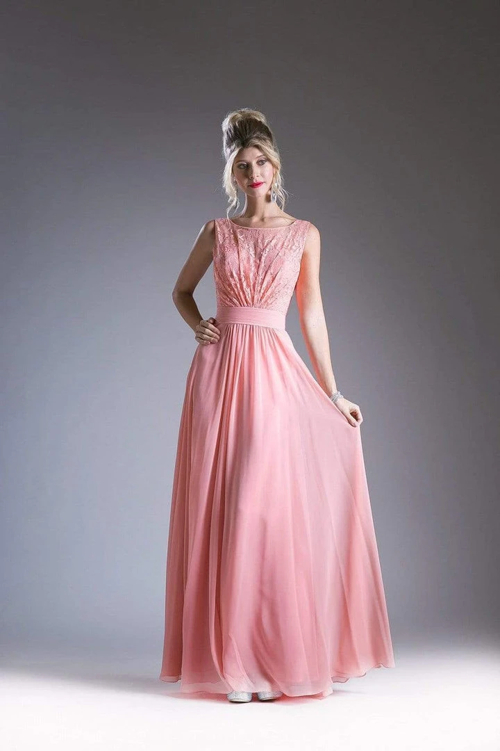 Make a statement with this dress by Cinderella Divine 1019. Glams in a sleeveless, bateau neckline with fitted bodice embellished with lace appliques. The bodice has a V-back and zipper closure while the waist is cinched in a pleated band. The skirt runs in full length hem and flares in an A-line silhouette. This Cinderella Divine dress is the perfect match for the girl who wants to look both sophisticated and fashion-forward.