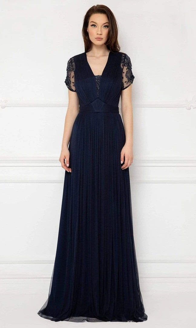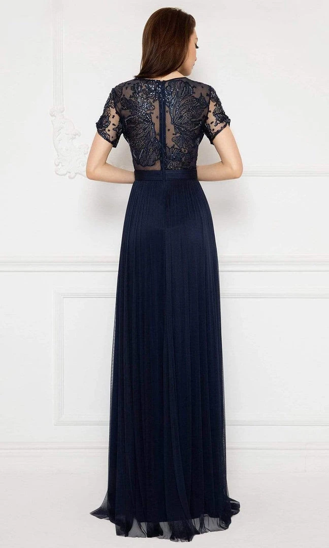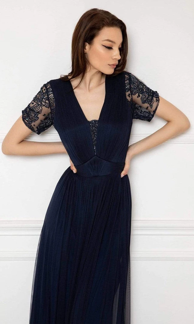Charms in a V-neckline with sheer embroidered short sleeves. The back has a zipper closure and from the waist features a full length sheath skirt. Model is wearing Navy color.