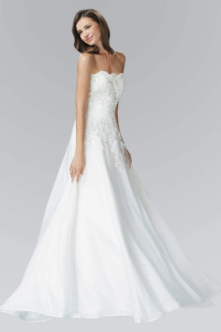 Have all eyes on you in this splendidly crafted masterpiece by Elizabeth K GL2077. A strapless semi-sweetheart neckline crowns the fitted bodice stunningly fashioned with bead embellishments. Shirring highlights the natural waist and leads to the A-line skirt that tapers to a full length hemline. A lace up closure secures the mid-open back, providing an adjustable fit. A lovely sweep train adds dramatic touch to the whole ensemble. Make it a night to reminisce with this Elizabeth K stunner.