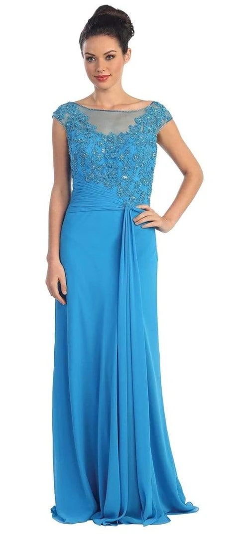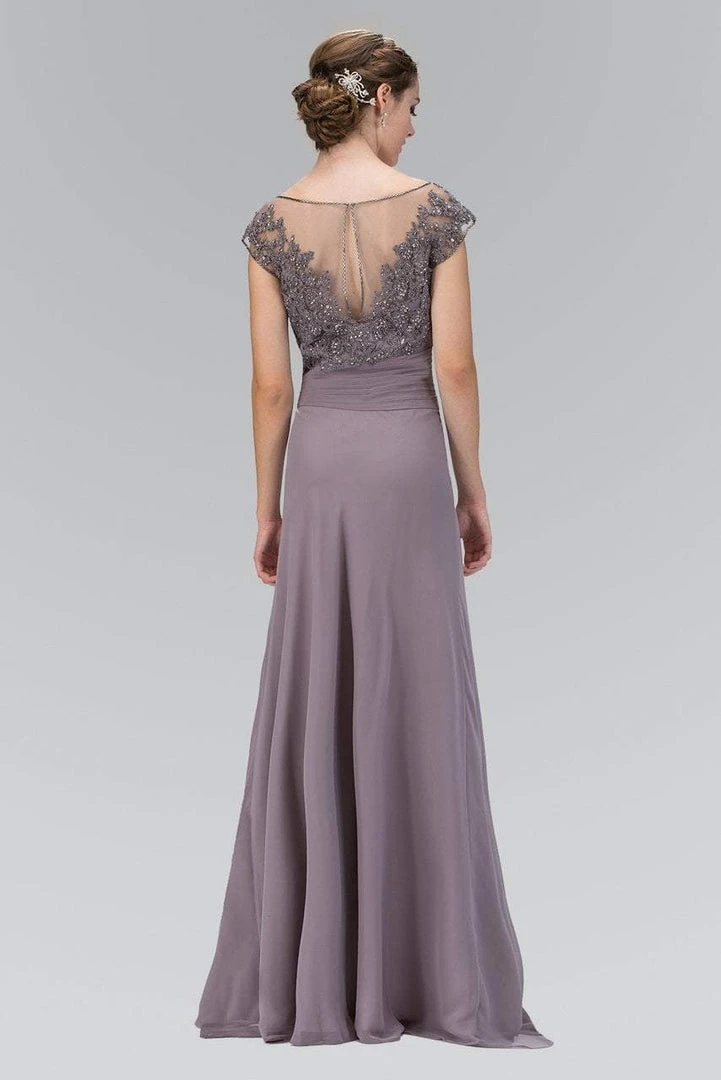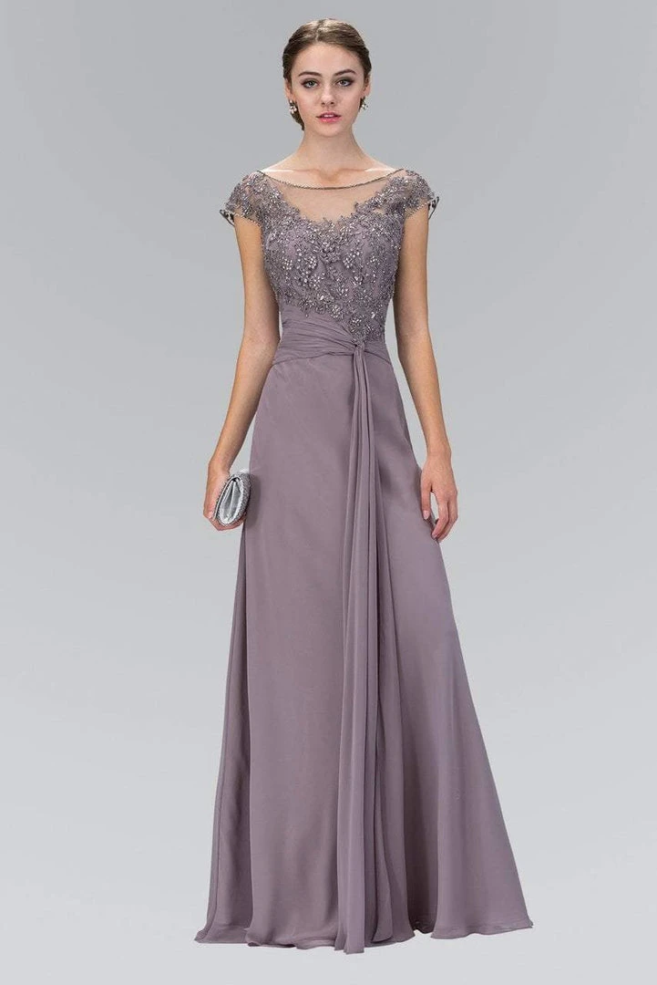 Appear in elegance in this design by Elizabeth K GL1100. Showcases cap sleeves, illusion bateau neckline with beaded bodice. The waist is accentuated by an asymmetrical pleat detail and completes the look in a Chiffon A-line skirt. Show off your feminine side with this Elizabeth K dress.