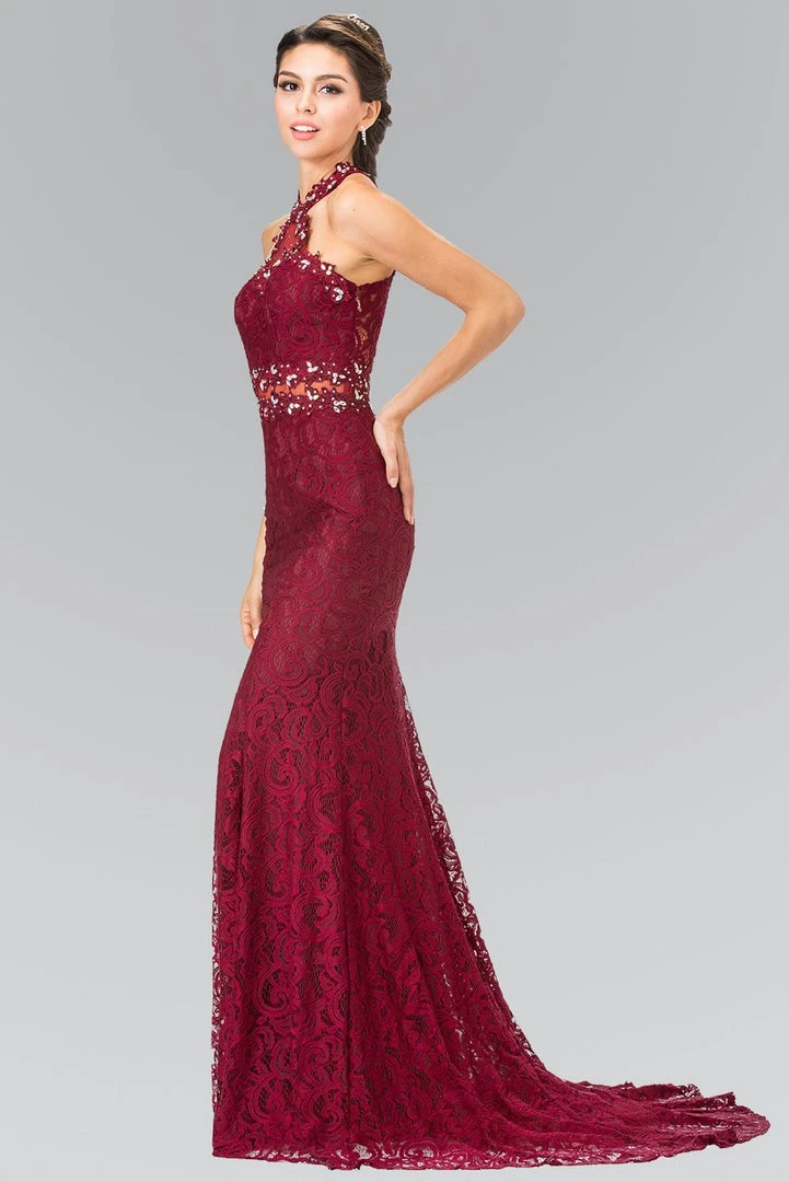 | Details: | Zipper, Lace, Sleeveless, Sheer fabric, Beading, Fitted bodice, Sheath skirt, Back keyhole, Train |