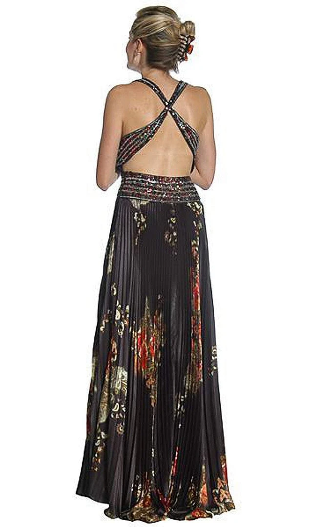 Captivate the crowd as you enter the room in this long dress by Eureka Fashion 2117. Features a sleeveless, V-neckline with thin straps and pleated bodice designed with print charmeuse. The back flaunts a criss cross open detail and flourishes a full length A-line skirt. Eureka Fashion will let you celebrate that divine feminine beauty! Model is wearing Black/Flower color.