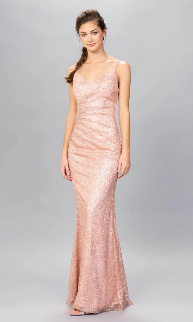 The gathered bodice features a flattering V-neckline and mid-open back as the skirt graces a sheath silhouette which finishes to a full length hemline. Model is wearing the Rose Gold color.