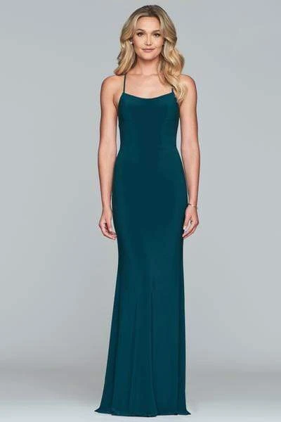 Made from a jersey knit fabric in a curve-skimming empire-waist sheath silhouette. Topped with a slightly scoop neckline and spaghetti straps that lead to a low, lace up back. The fitted bodice hugs your perfect curve and falls with flair from the knees down to the floor length to a modest hemline.