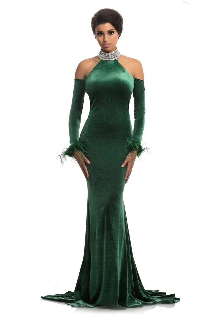 Radiate class and poise as you channel red carpet glamour wearing this evening gown by Johnathan Kayne 9015. This long formal evening dress is fabric in vibrant stretch velvet, featuring a halter style embellished high neckline, cold shoulder cut out and long sleeves with faux feathers on the cuffs. The long skirt is fitted on the hips and flare from the knee down into the floor cascading to a mermaid silhouette. You are sure to spice up the evening on the red carpet in this fabulous Johnathan Kayne creation.