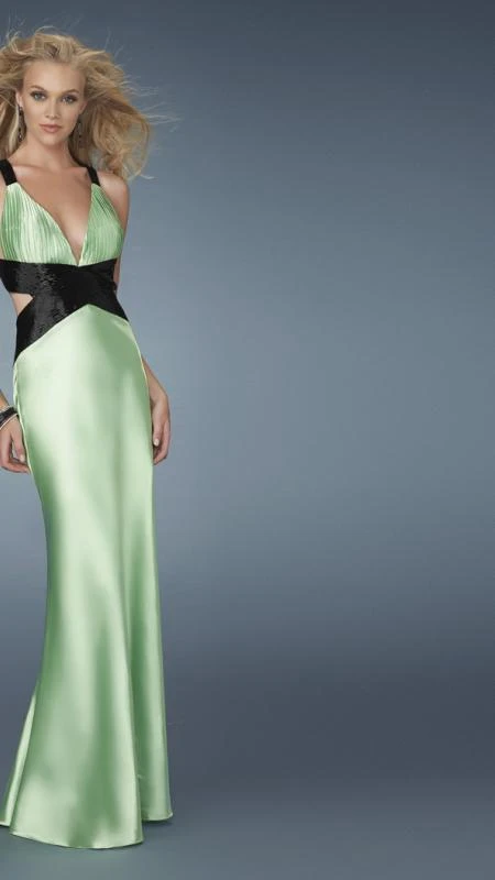 Sizzle all night in this fabulous satin halter gown by La Femme Gigi 14660. Features an elegantly pleated deep V bustline with contrasting black crisscross empire waistband. The back boasts an alluring crisscross cutout. This La Femme Gigi collection is sure to be an attention-grabber at your every move.