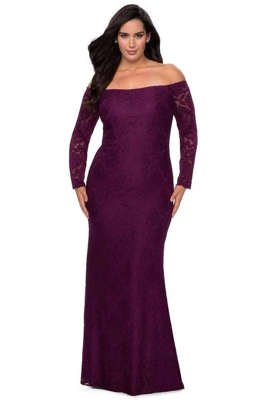 This gorgeous lace dress pleases with an off the shoulder neckline and long sleeves. The fitted bodice has a back zipper closure and the sheath skirt finishes in a sweep train.