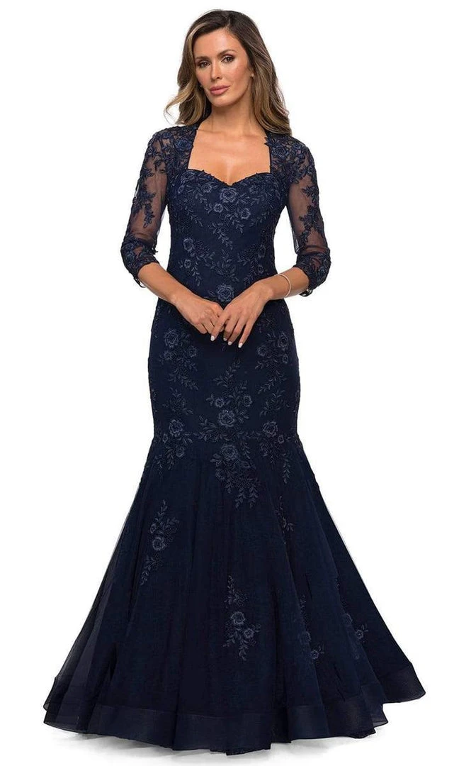 A full-length embroidered floral lace mermaid gown with modified square neckline and sheer quarter length sleeves. The fitted bodice charms with a sweetheart shape bustline, sculpted with form flattering seam to highlight your curve. The frothy mermaid skirt flourishes to the floor with horsehair trim adding flair and style.