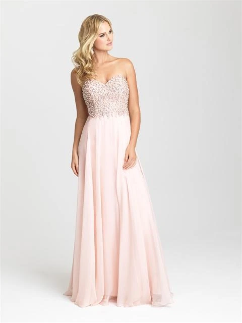 Finished with a pearlescent glow, this strapless chiffon gown is available in three pastel hues.