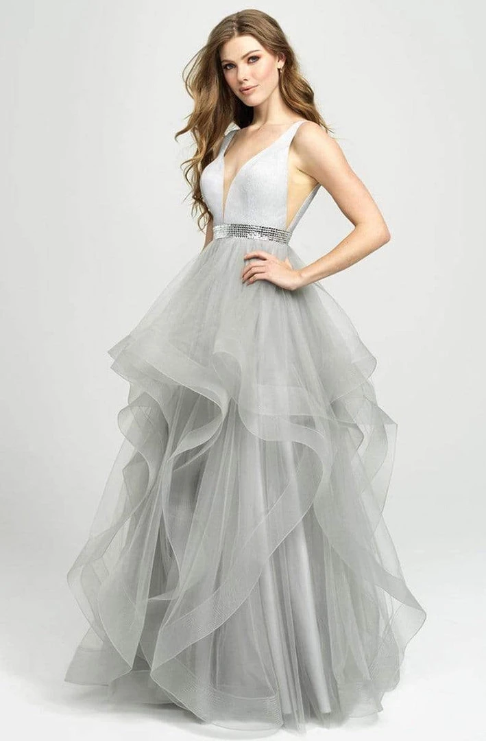 Create a perfect evening wearing this captivating masterpiece by Madison James 19-138. Contoured with princess seams, the fitted bodice features a plunging V neckline and sides, complemented with an open V back. The beaded belt accent the natural waist for a cinching effect as it leads to voluminous ruffled ballgown skirt with a sweep train and then cascades beautifully to full length. Take a look at this breathtaking evening dress by Madison James design.