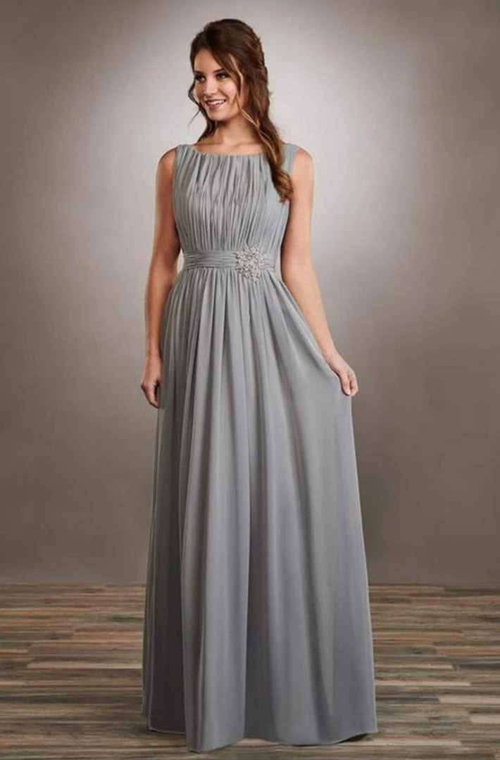 Floor length chiffon A-line dress with a draped bodice and gathered skirt. Features a bateau neckline and V-shaped back with a beaded flower motif at the waist.