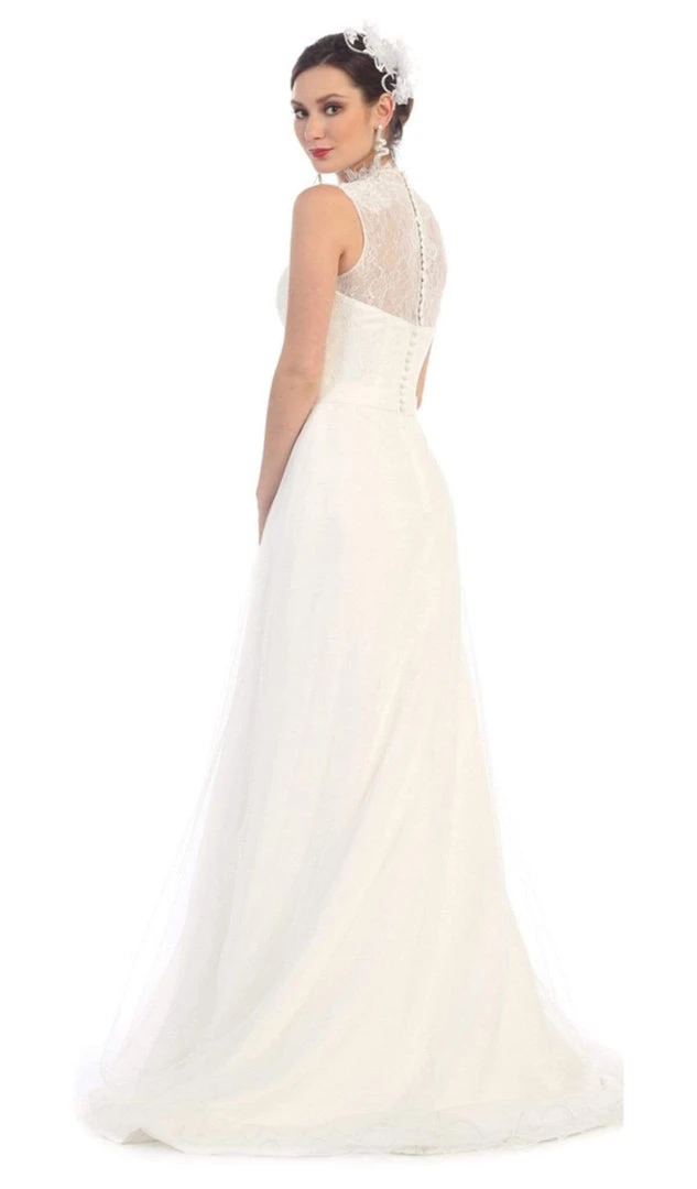 Go beyond beautiful in this precious bridal gown from this May Queen RQ-7380. An illusion V neckline and cap sleeves frame the fitted bodice wrapped in stunning lace. The a-line skirt elegantly cascades to the floor as it finishes with a small train. Apparent buttons secure the sheer full back. You are a picture of perfection with this May Queen ensemble.