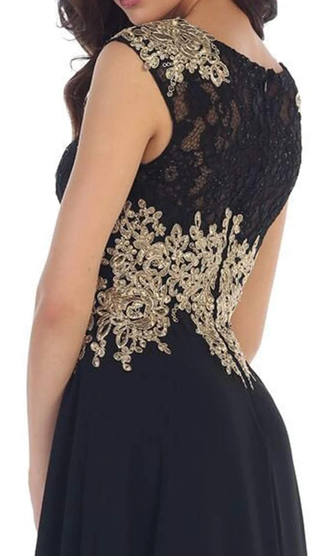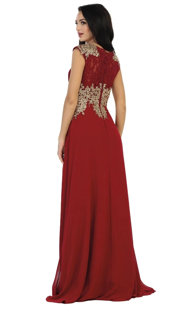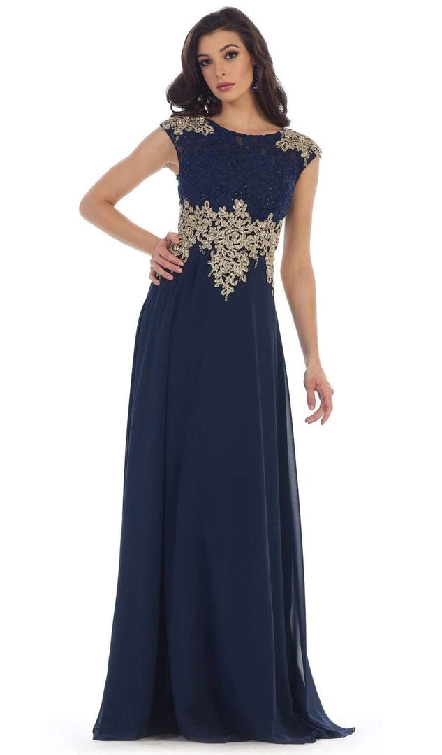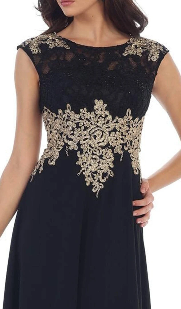 Make your grand entrance in this long formal by May Queen MQ1460. Features cap sleeves and an illusion bateau neckline. The top is lavishly ornate with lace appliques and gild embellishments. The skirt runs in full length hem and flares an A-line silhouette finishing a sweep train. This May Queen look is sure to be an attention-grabber in any occasion.