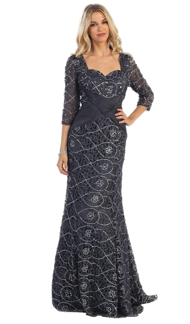 Make the best impression at your next special event with this enthralling delicate creation. This chic gown shows a sweetheart neckline, sheer three-quarter sleeves and a v-shaped open back. Accentuated at the midriff with a finely-ruched fabric, the entire mermaid silhouette displays a lavish lace fabric with intertwined silver accents for that touch of sparkle. The skirt fit and radiates down to the floor with a gentle subtle train. Impress and turn heads as you don this gown of subtle sophistication. The images only represent this dress in the Champagne color.