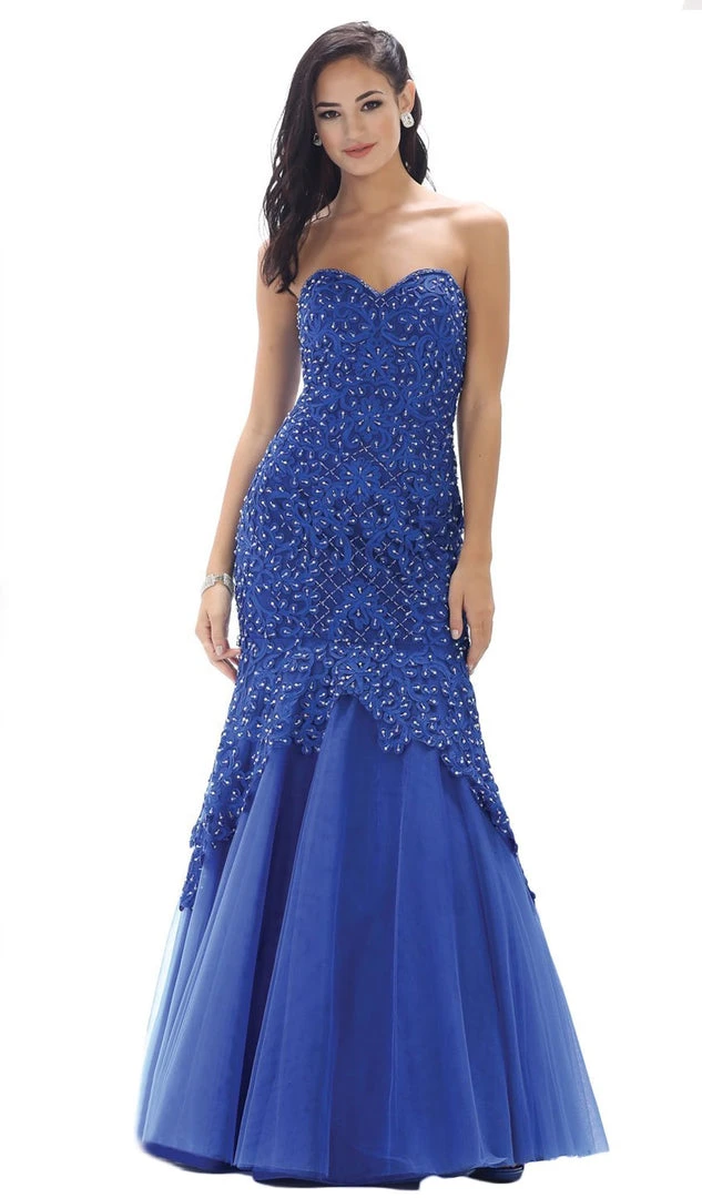 Make a statement with this dress by May Queen RQ7445. This strapless dress offers a sweetheart neckline with lace and embroidered detailed bodice. This dress also has embellished details providing that spark for added elegance. This mermaid skirt creation also has a mid-open back design with lace up closure. This May Queen creation definitely parades the elegant and classy style.