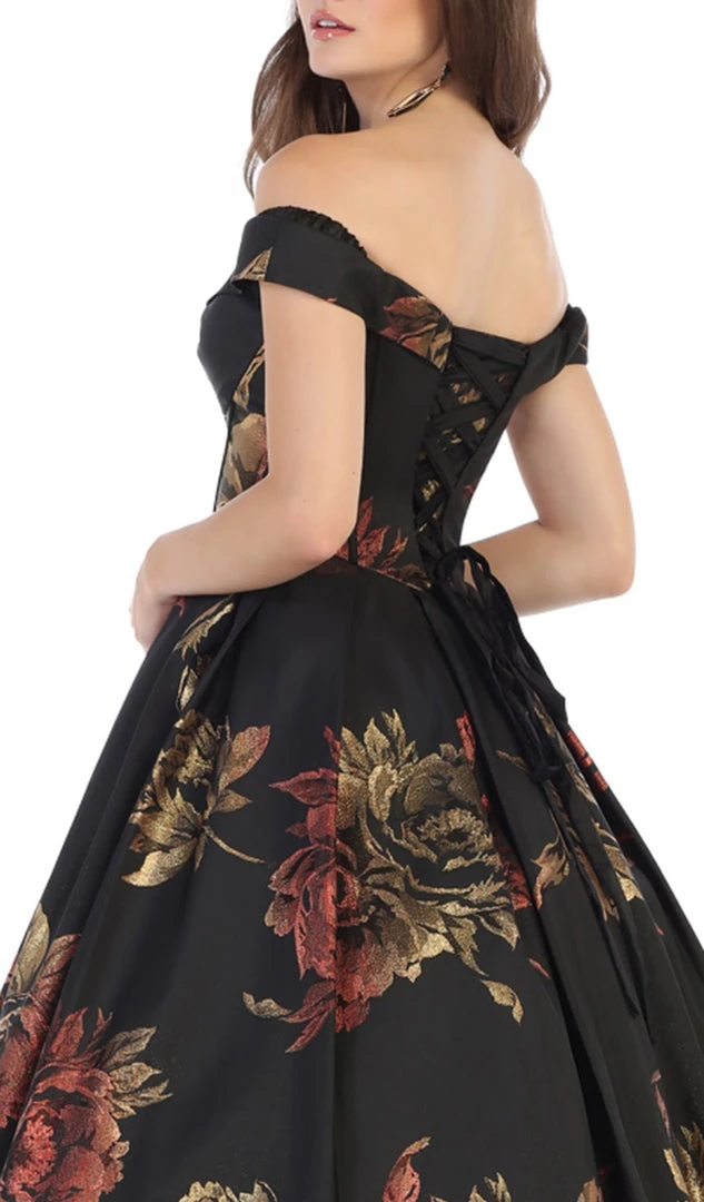 Optimize the attraction of your special event in this alluring gown by May Queen RQ7675. Brandishes in a deep off the shoulder neckline with mesh at fitted bodice. The back has a lace up closure for an adjustable fit. From the waist begins a pleated, floral patterned ballgown skirt. Walk in a defined sophistication and beauty wearing May Queen.