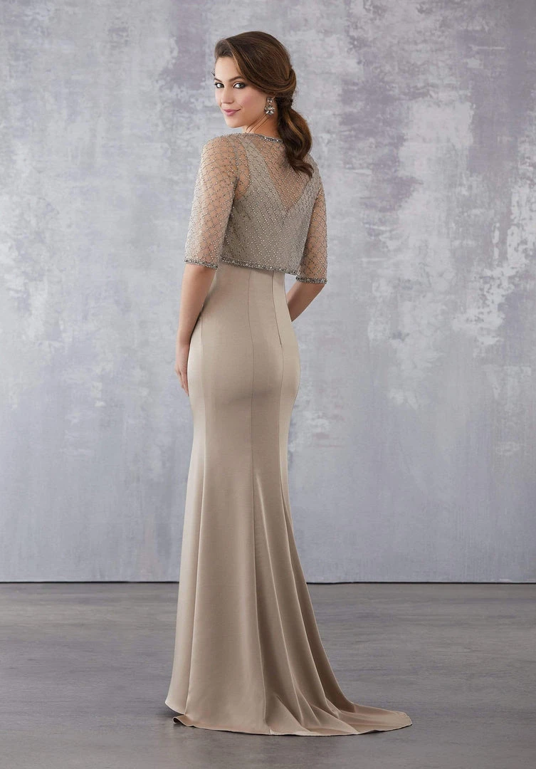 Make an extraordinary statement when you walk in this classy dress by MGNY By Mori Lee 71732. This long dress features a sleeveless, v-neckline with fitted bodice styled with visible seams. The trumpet skirt finishes in a sweep train. The dress is tailored with a matching embellished jacket. This trendsetting dress is sure to get you noticed.