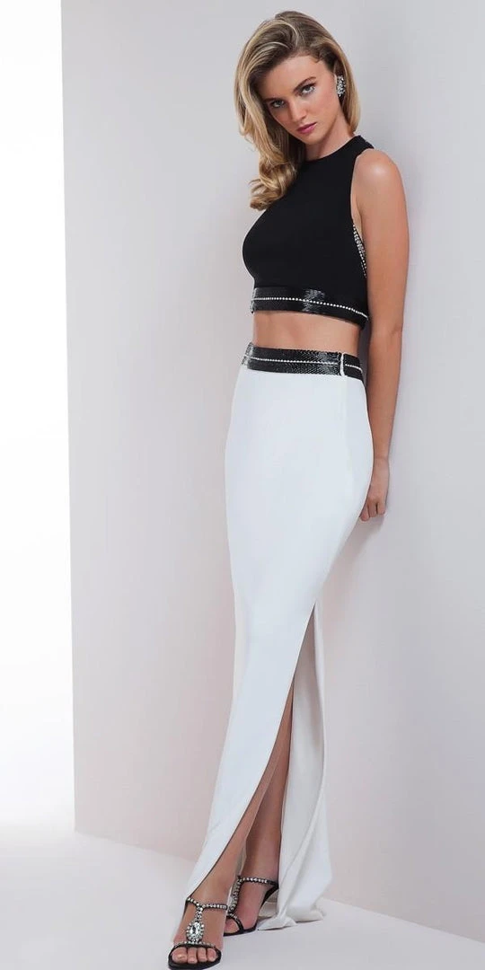 Look gorgeous in this Mignon VM1575 ensemble. This two piece dress showcases a halter neckline as the skirt displays a sheath silhouette accented with a side slit. Be fashionable with this Mignon dress.