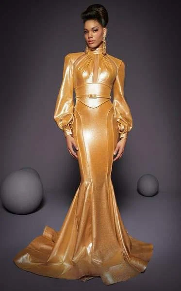 Sophistication exudes when your wear this ultra-fabulous MNM Couture 2474 evening dress to your next special event. Framed with a high neckline and bishop long sleeves, the ruched bodice features sheer panel details at the cut-in shoulders and center of the bust. A thin belt highlights the waist as tailoring seams form the perfect fitting of the skirt. This gown offers a mermaid silhouette that gorgeously cascades to the floor finished with a sweep train for a dramatic touch. A triangular cutout detail highlights the back. Perfect for any occasion, this marvelous MNM Couture dress has a sophisticated style that will captivate the crowd.