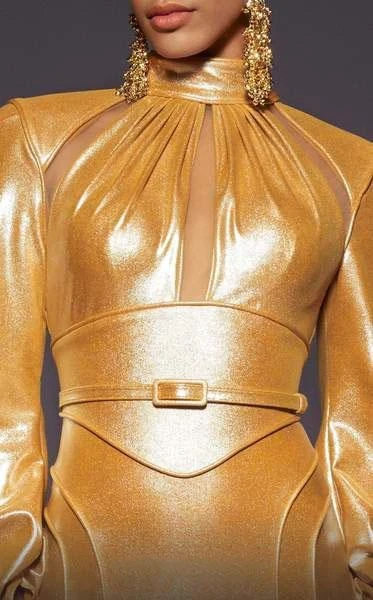 | Details: | Ruched Bodice, Sheer Cutout Panels, Bishop Long Sleeves, Thin Waist Belt, Seamed Skirt, Floor Length, Back Cutout, Sweep Train |