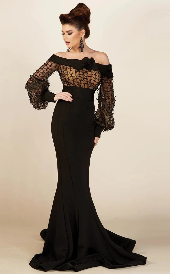 Opt to secure stunning opulence when you don this fabulously made MNM Couture S0006L creation. Stunningly detailed with minute ribbon details on a sheer fabric, this refined piece boasts of an off shoulder design with a folded neck panel and a rosette accent. Flanked with long sleeves defined in cuffed bell sleeves, the waist is cinched with a wide band for that gorgeous fit. The mermaid skirt slides along the feminine curves to create a lush pool of train. Endlessly captivate the crowd with your presence in this MNM Couture masterpiece. Model is wearing the Black color.